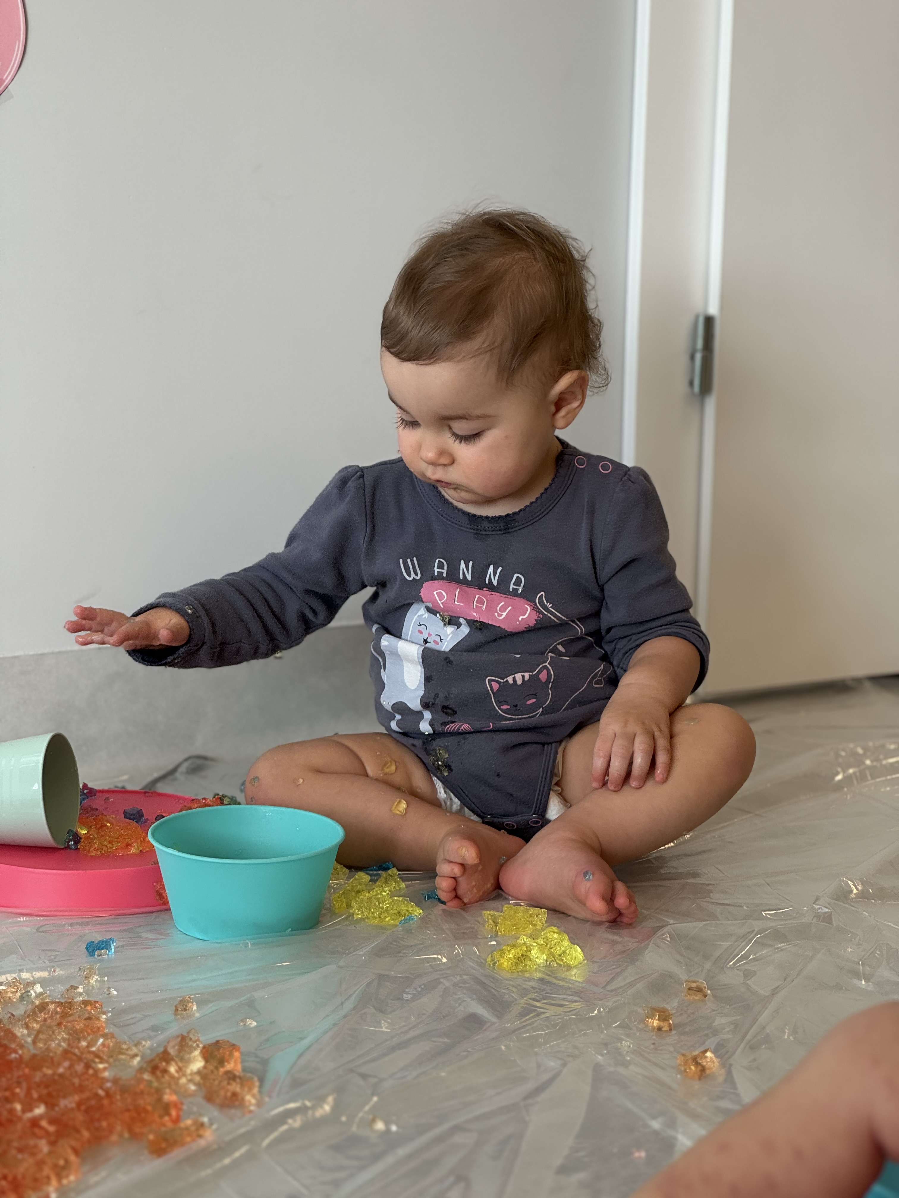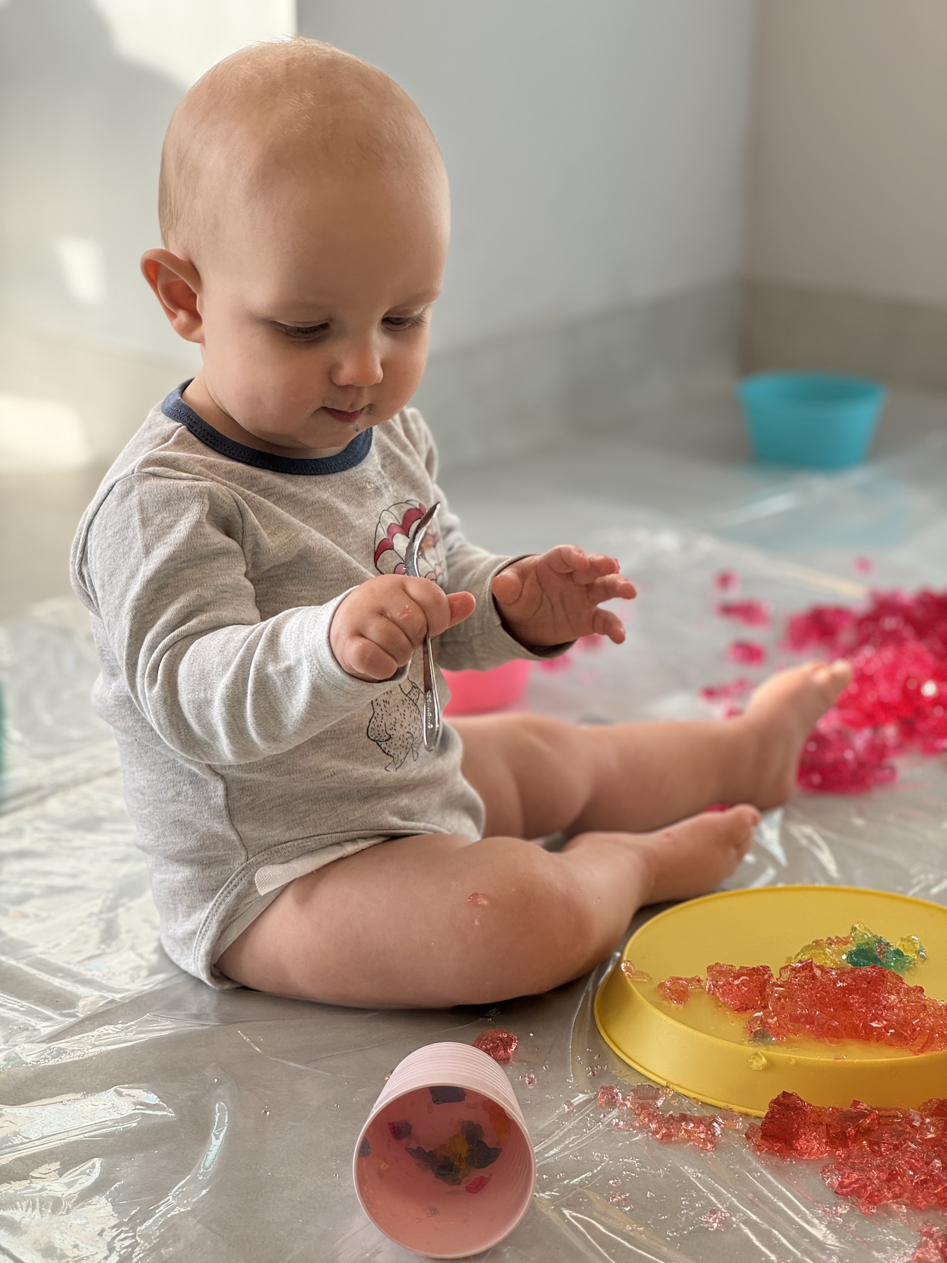 Nie zabrakło także smakowania – maluchy próbowały galaretki, odkrywając jej owocowe smaki. Ta sensoryczna przygoda dostarczyła mnóstwo radości i śmiechu, wspierając przy okazji rozwój zmysłów naszych najmłodszych.